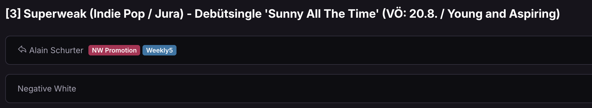 At Negative White, we receive well over 200 promotional emails every week, ranging from new songs, EPs, and albums to news and product launches. And that’s only a fraction of what’s buzzing around the web. The top priority for me—especially given that this is voluntary work—is efficiency: quickly grasping what it’s all about. Quickly recognising whether it’s relevant.