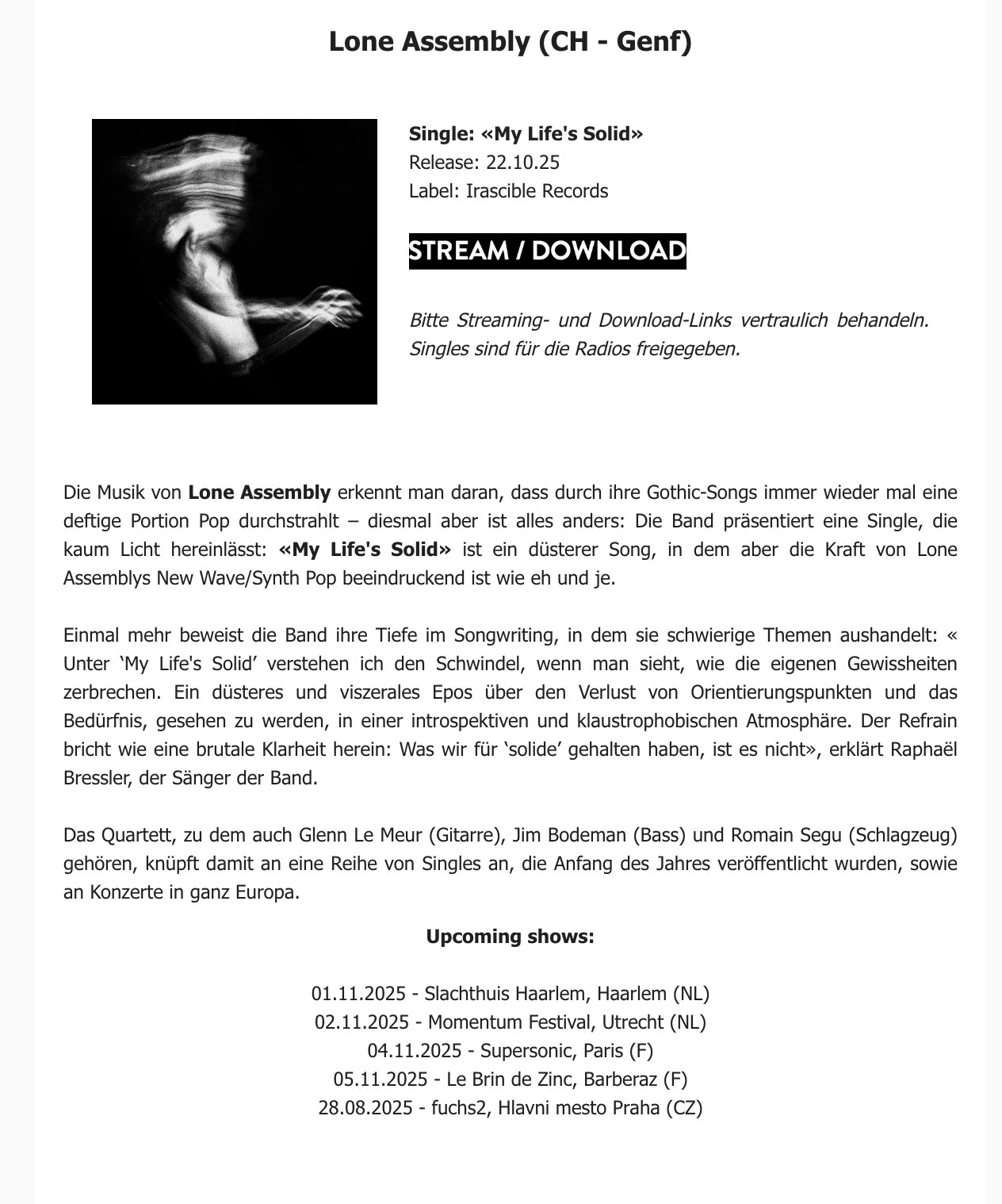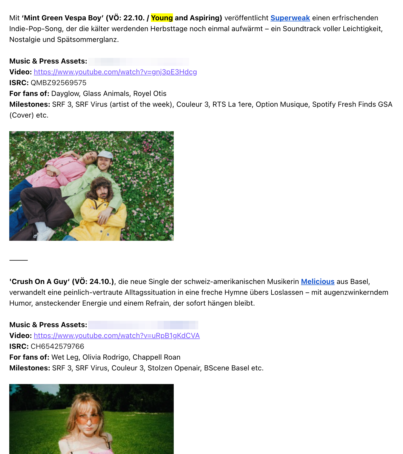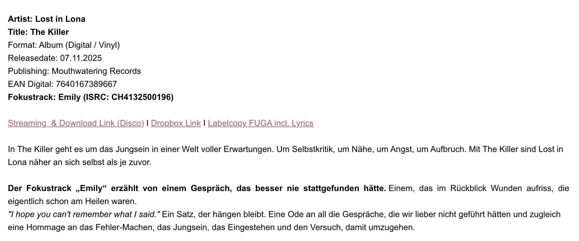 The email itself should also be kept concise. A short introduction to the music being promoted is sufficient. The language can be more colourful here, but you shouldn’t overdo it; instead, let the music speak for itself. More critical are clearly communicated links to more detailed information in an electronic press kit (EPK).