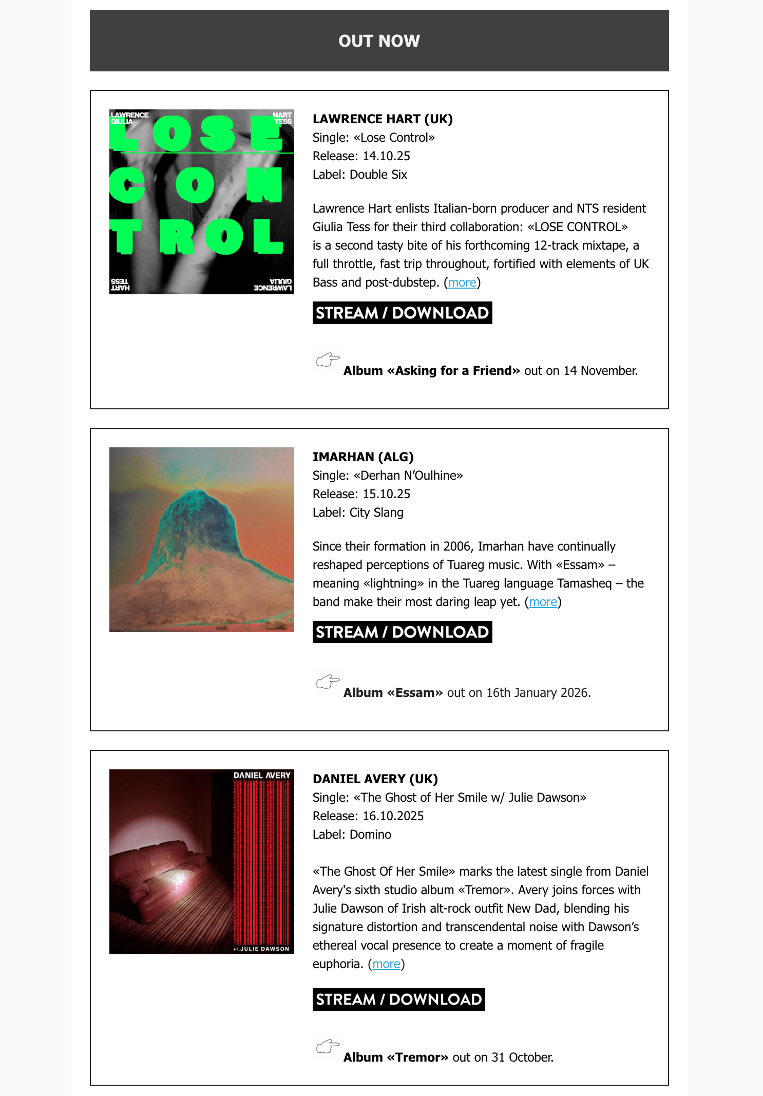Something I personally appreciate is a summary newsletter from labels, which provides all releases at a glance in one email. Of course, the same rules apply here as for individual promotion.