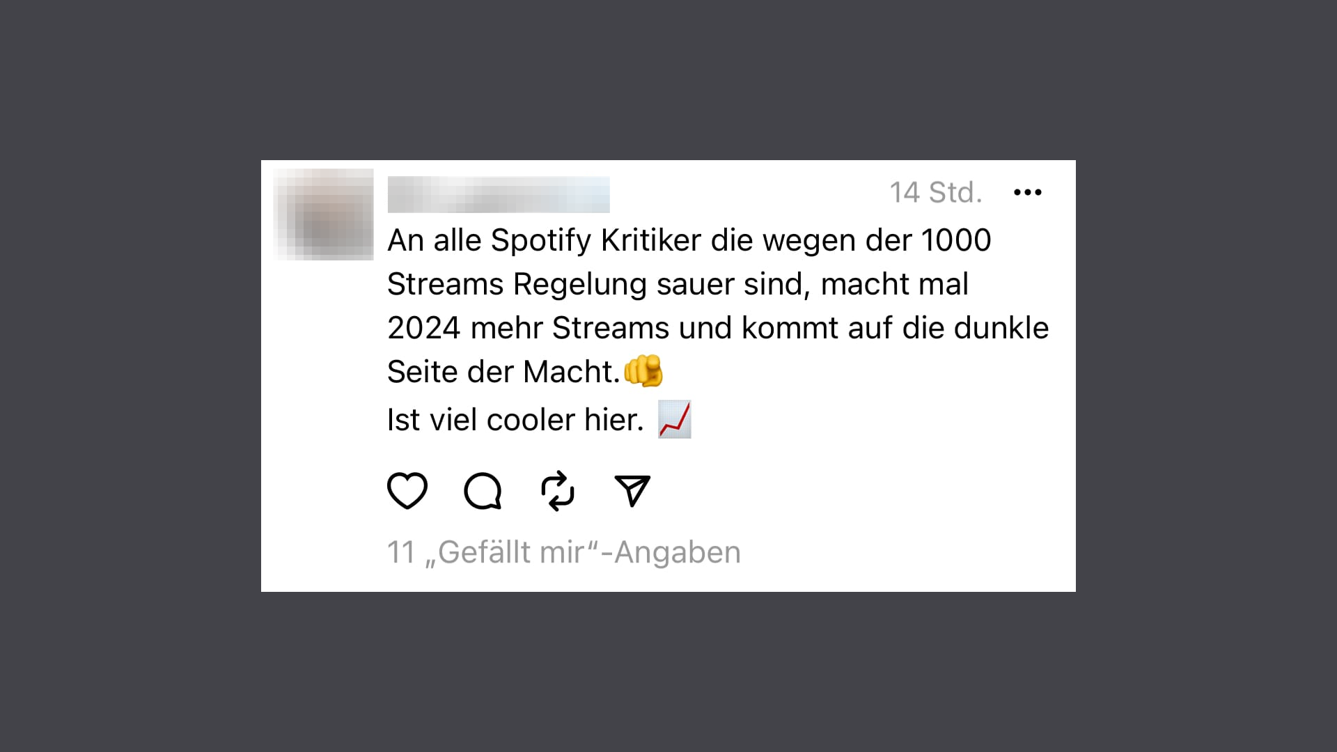 What's next? Artists only get paid if a song has 10,000 or 100,000 streams? Or if they have 10,000 monthly listeners? Or if they release a new track each month? Crossing that red line is a potential floodgate opener to all sorts of dystopian ideas not to pay the people who deliver the platform's content. That's what we should be worried about—not the number of 1000 streams itself.