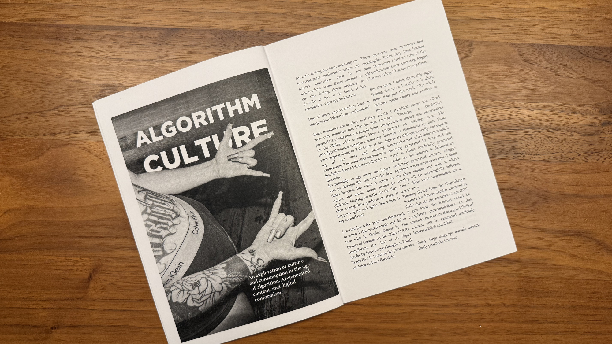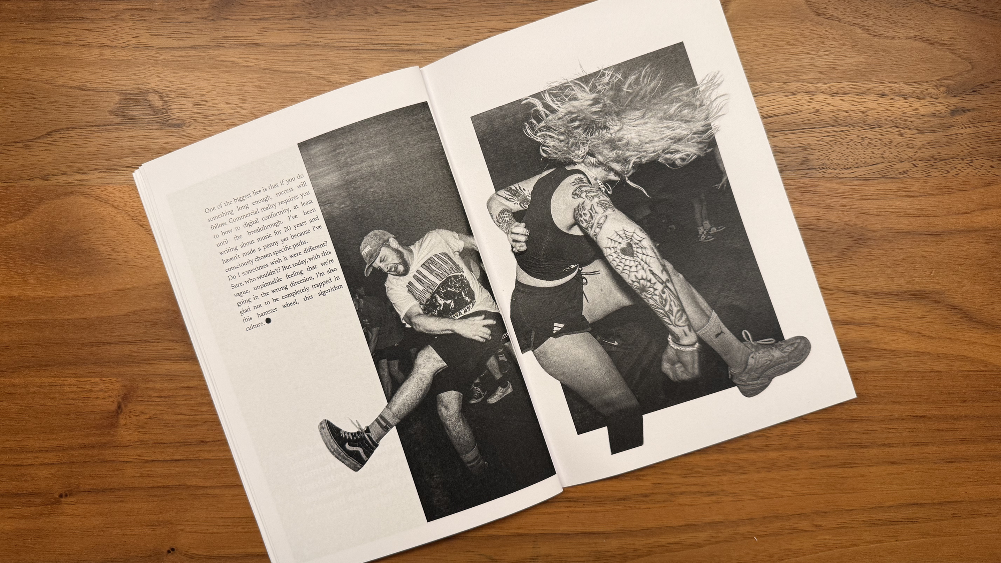 Spanning 20 pages, it features three heavily updated and edited essays on the relationship of music and culture in an era of AI and digitisation. The zine is illustrated with gripping photos, shot by our resident photographer Evelyn Kutschera, perfectly matching the zine's DIY aesthetic. It even has a makeshift "poster" in the middle.